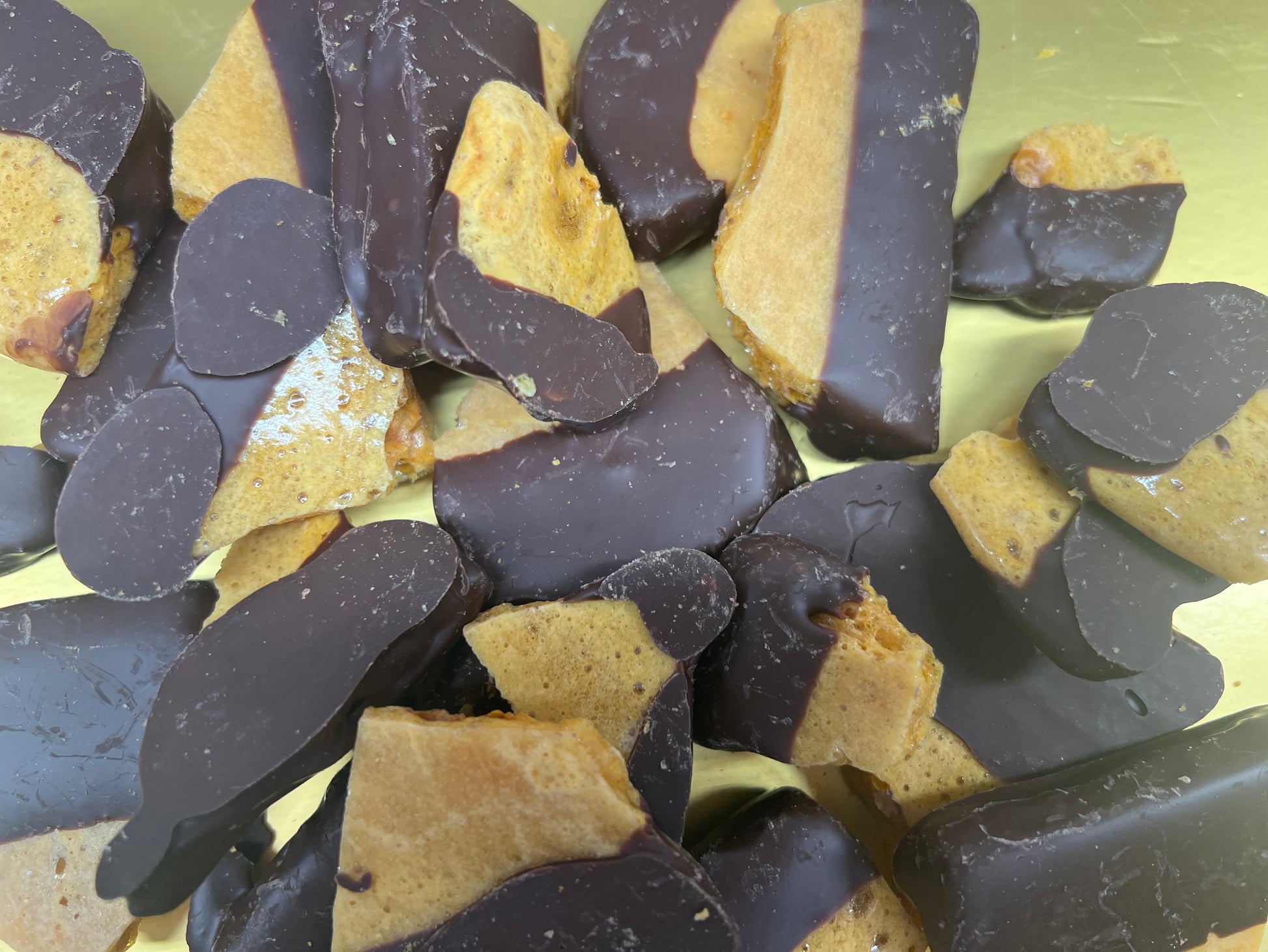 You may be familiar with our honey foam bar, but I reversed the recipe today. THIS time the chocolate is on the outside. Each chunk of honey foam has been dipped in delicious 70% dark chocolate. Your new favorite treat and it make a great gift!